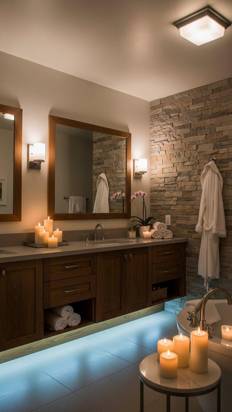 When you layer light thoughtfully, your bathroom shifts from bright and utilitarian to a warm, spa-like sanctuary that welcomes quiet evenings. You’ll combine dimmable sconces for soft, adjustable task glow with subtle floor uplighting to lift shadows and add depth.