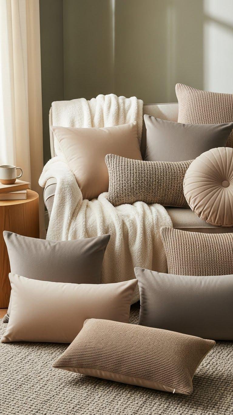 You’ll layer neutral velvet cushions with airy tonal knits to create tactile contrast that feels effortless. Mix sizes and shapes, drape a soft throw over an arm, and choose muted hues that free your style.