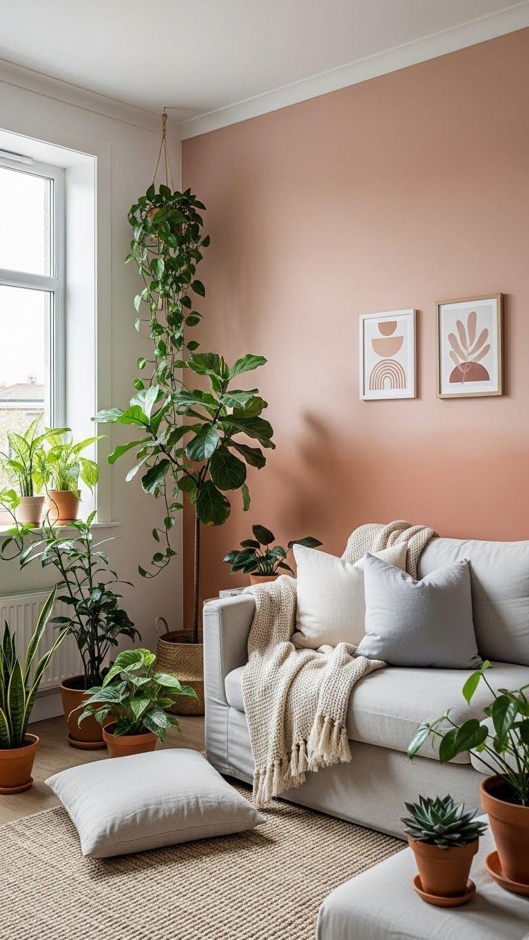 If you love the soft, neutral textures of throws and pillows, bring in an earthy terracotta accent wall to anchor the space and add warmth without overwhelming it.