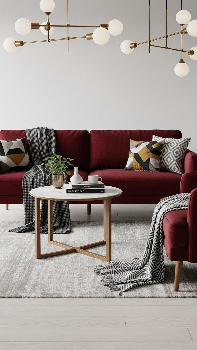Think of a dark cherry red sofa as your room’s confident centerpiece—you’ll get instant warmth and a touch of luxe without overpowering the rest of your palette.