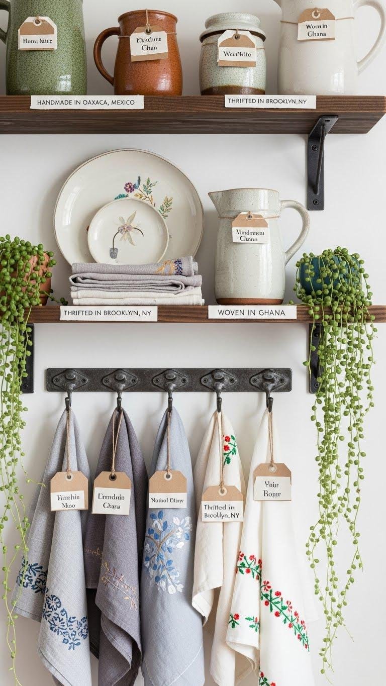 When you style open shelves with artisan finds, they become a storybook of textures and memories rather than mere storage. You’ll arrange ceramics, thrifted glass, and woven baskets with intent, using handmade hooks for hanging linens and plants. Add curated labels to tell each piece’s origin, keep negative space, and rotate items seasonally so your shelves stay personal, airy, and easy to live with.