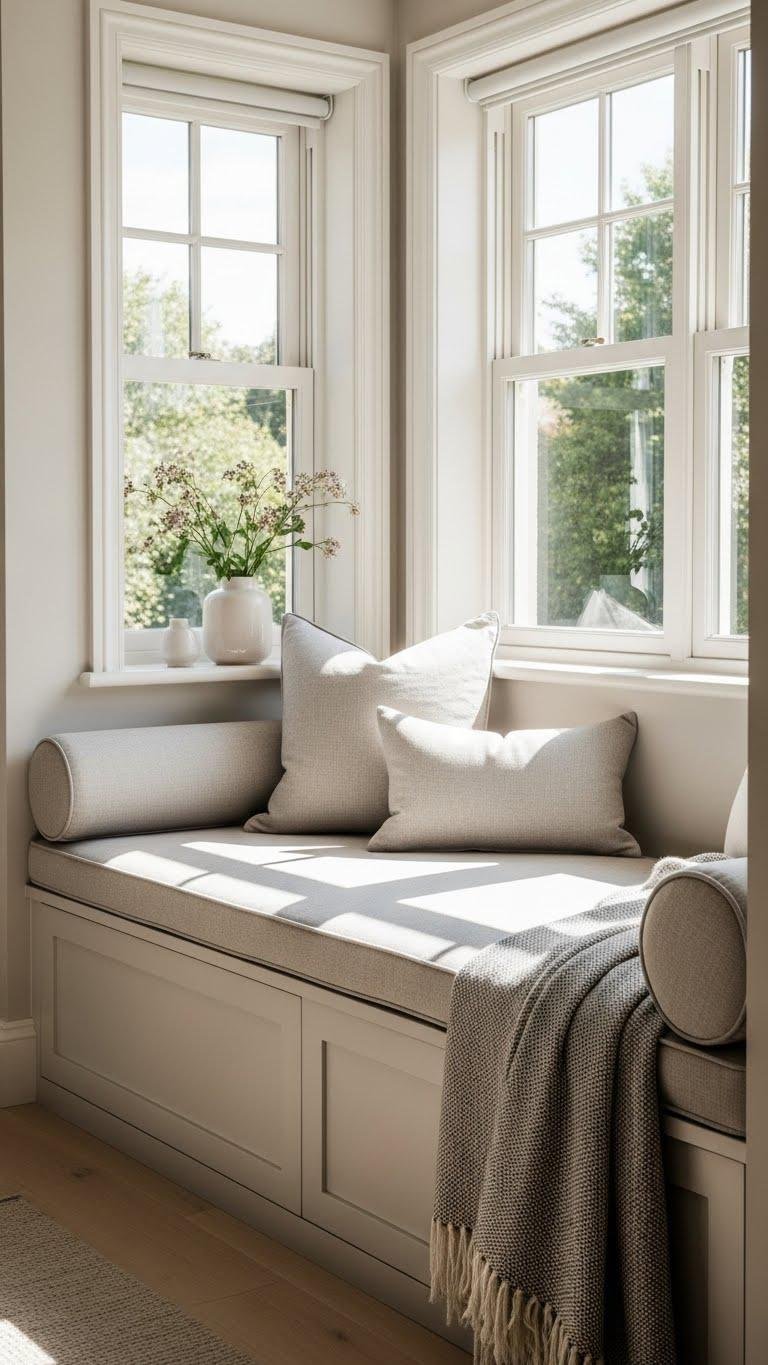 A neutral upholstered window seat anchors a room with quiet sophistication, giving you a cozy perch that feels both timeless and on-trend.