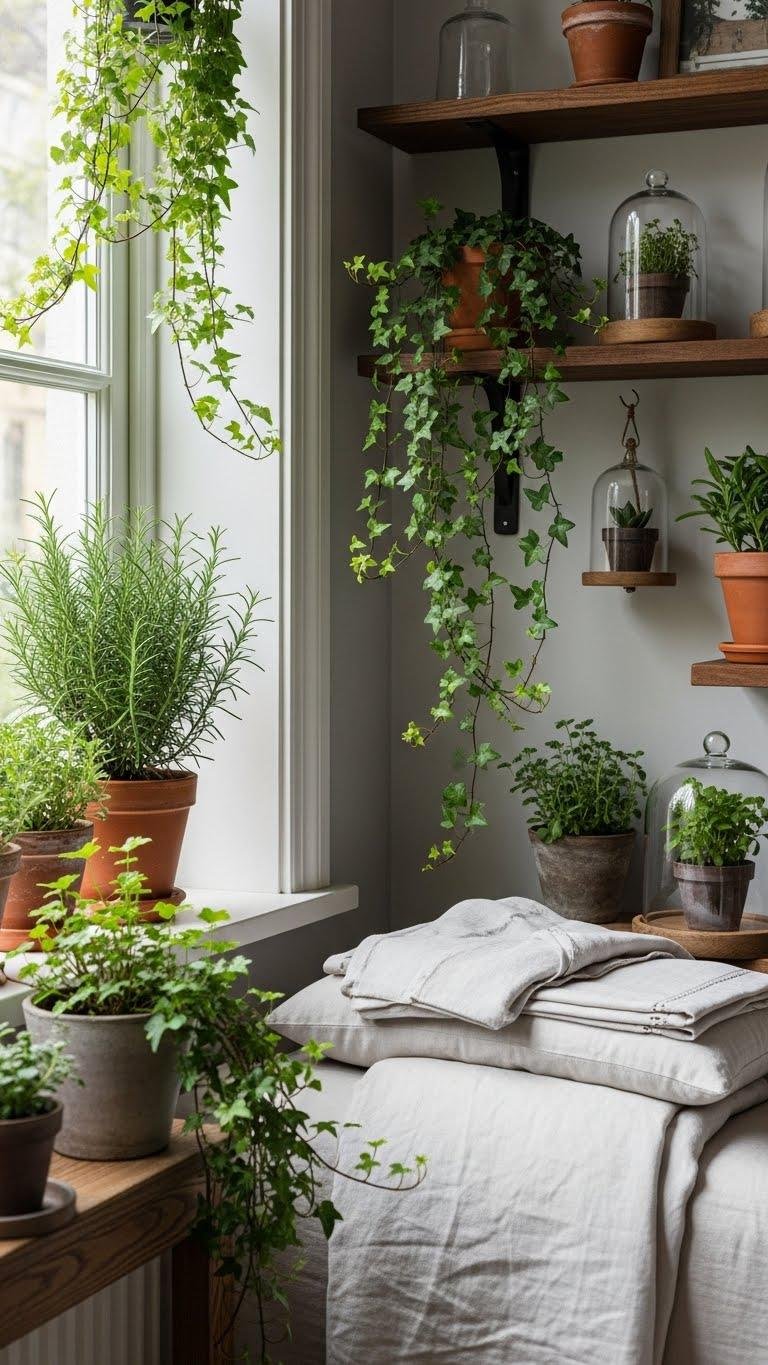 You’ll place potted rosemary by windows for fragrance and resilience, let trailing ivy soften shelves and frames, and mix small pots and glass cloches for an effortless, free-spirited botanical vignette.