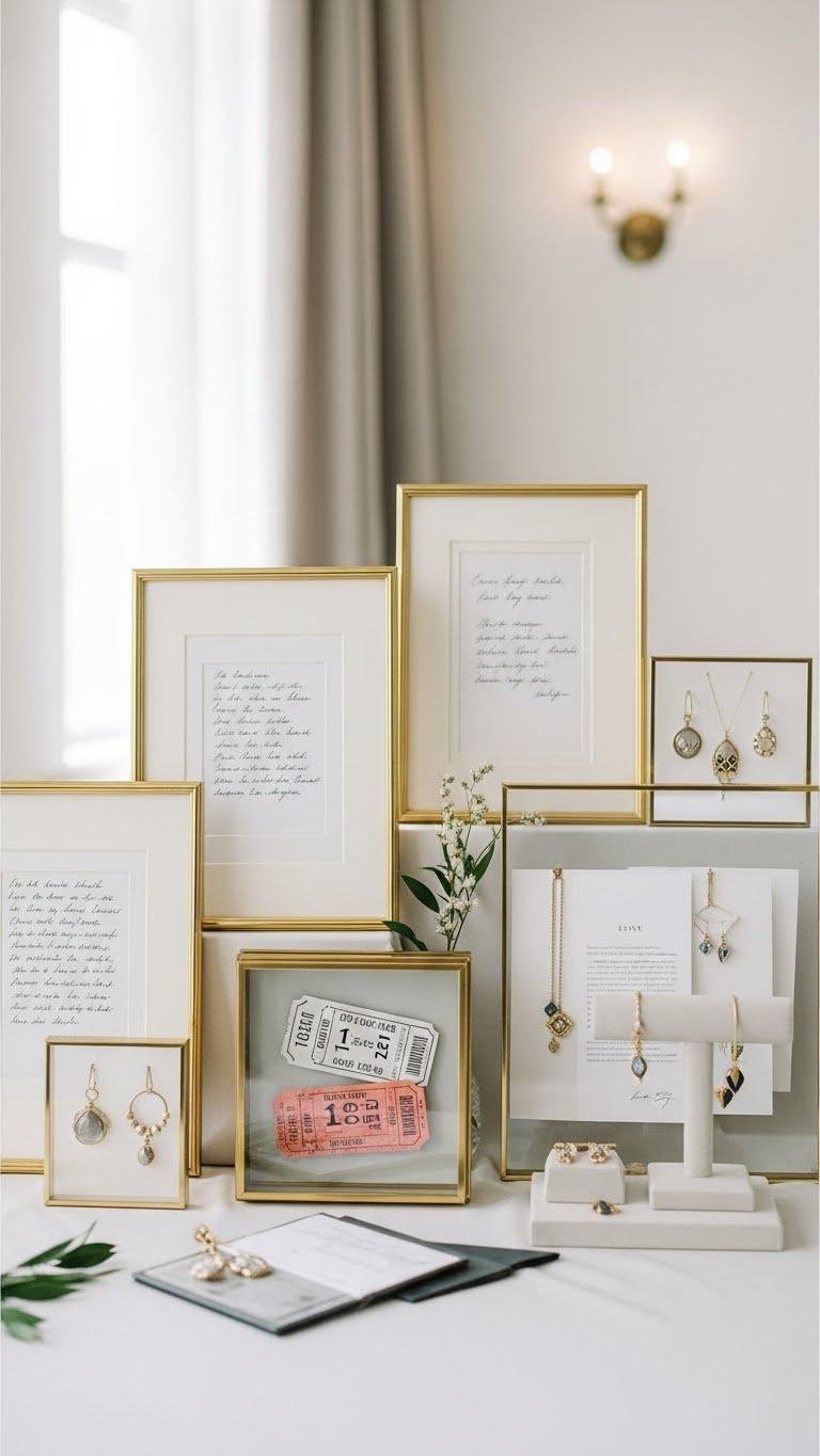 You’ll choose slender frames for handwritten love notes, shadow boxes for ticket stubs, and a minimal heirloom jewelry display that respects negative space. Keep palettes quiet, arrange asymmetrically, and let each piece breathe so your story feels elegant and free.