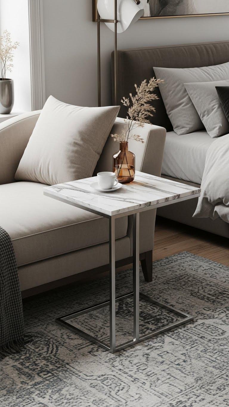 Place a marble-topped side table beside a chaise or bed to introduce quiet luxury without shouting for attention.