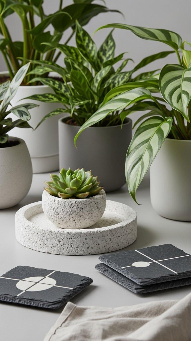 Pairing stone with your indoor greenery sharpens the sensory contrast—cool, tactile surfaces against soft, living leaves. You’ll pick pumice trays for sculptural utility and slate coasters for minimalist, durable service.