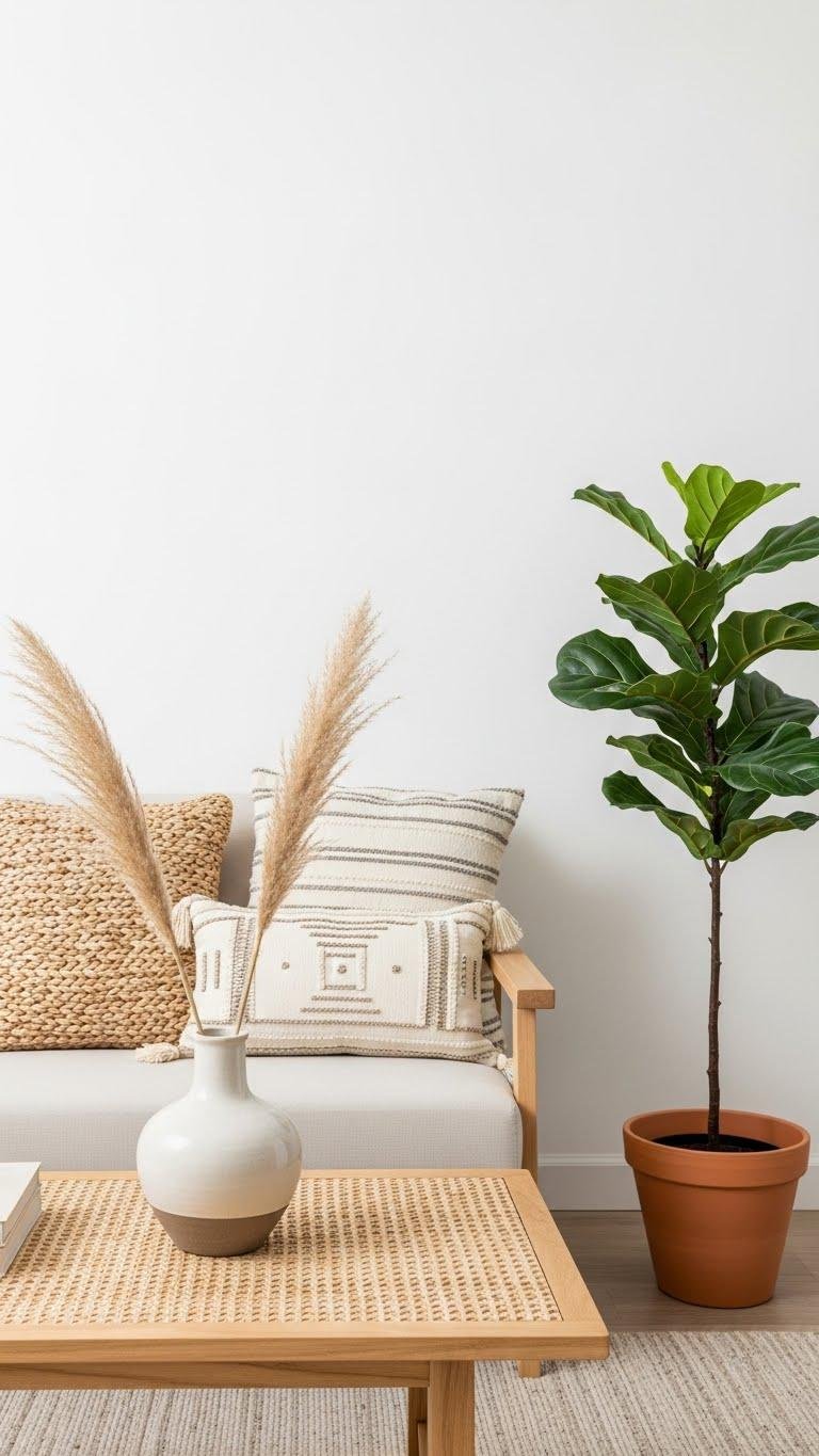 Toss moss pillows on a linen sofa, mix matte ceramics, and let the muted greenery calm the room while you maintain clean lines and airy movement.