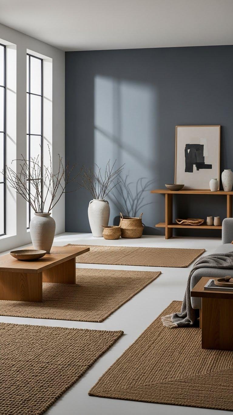 Layering those seagrass and jute rugs sets a soft, natural base you can pair with gentle grays to keep the room feeling modern and calm.