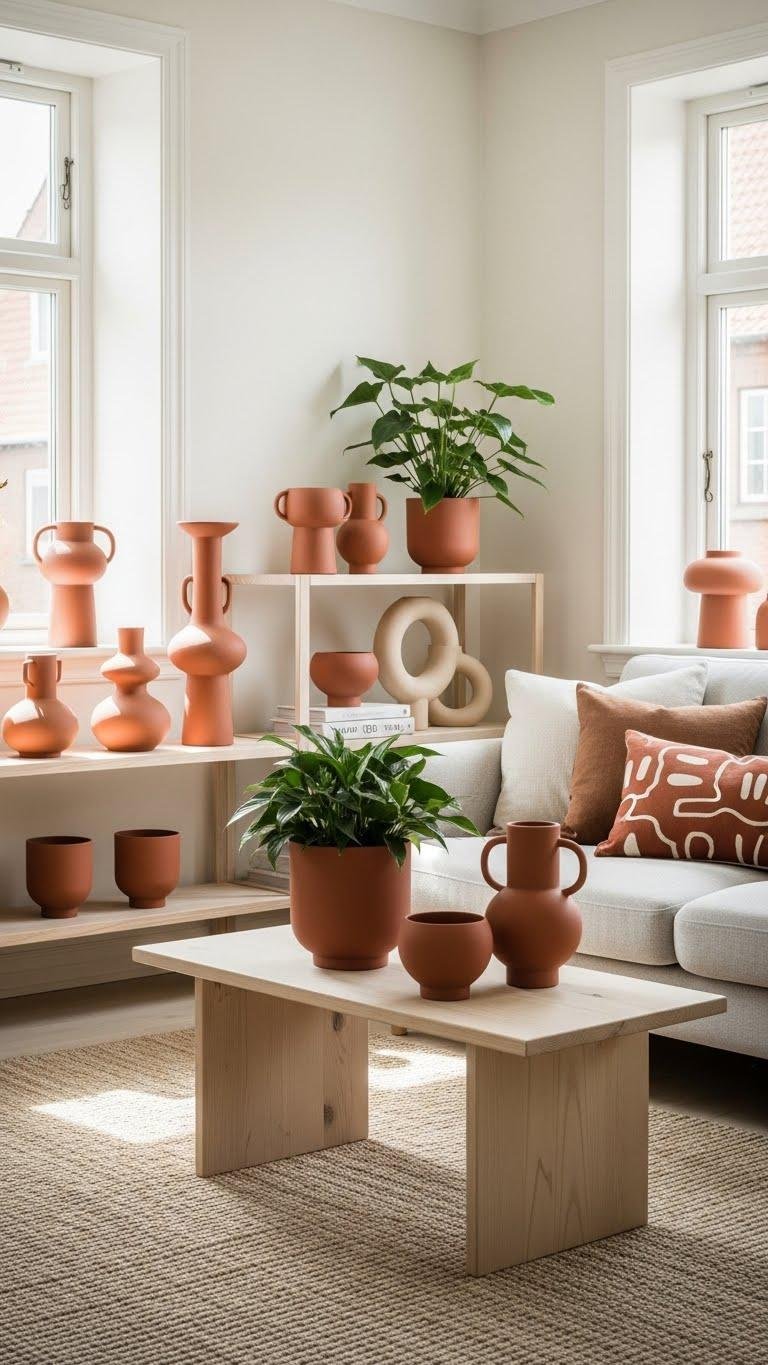 Although soft and restrained, muted terracotta injects an earthy warmth that grounds pale Scandinavian palettes without overpowering them. You’ll introduce terracotta through small, intentional pieces—sculptural vases, matte planters, or a single clay tray—so the color reads as confidence, not clutter.