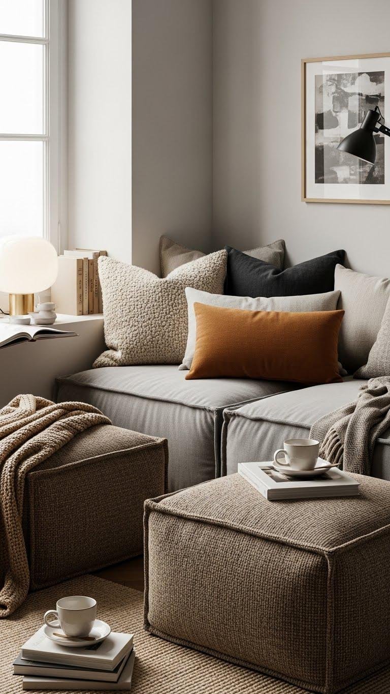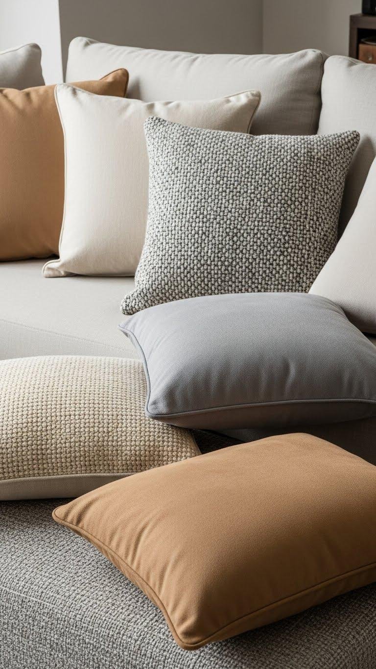 When you mix cushions in a tight neutral palette—think warm ecru, soft gray, and sandy taupe—you get instant cohesion without feeling flat.