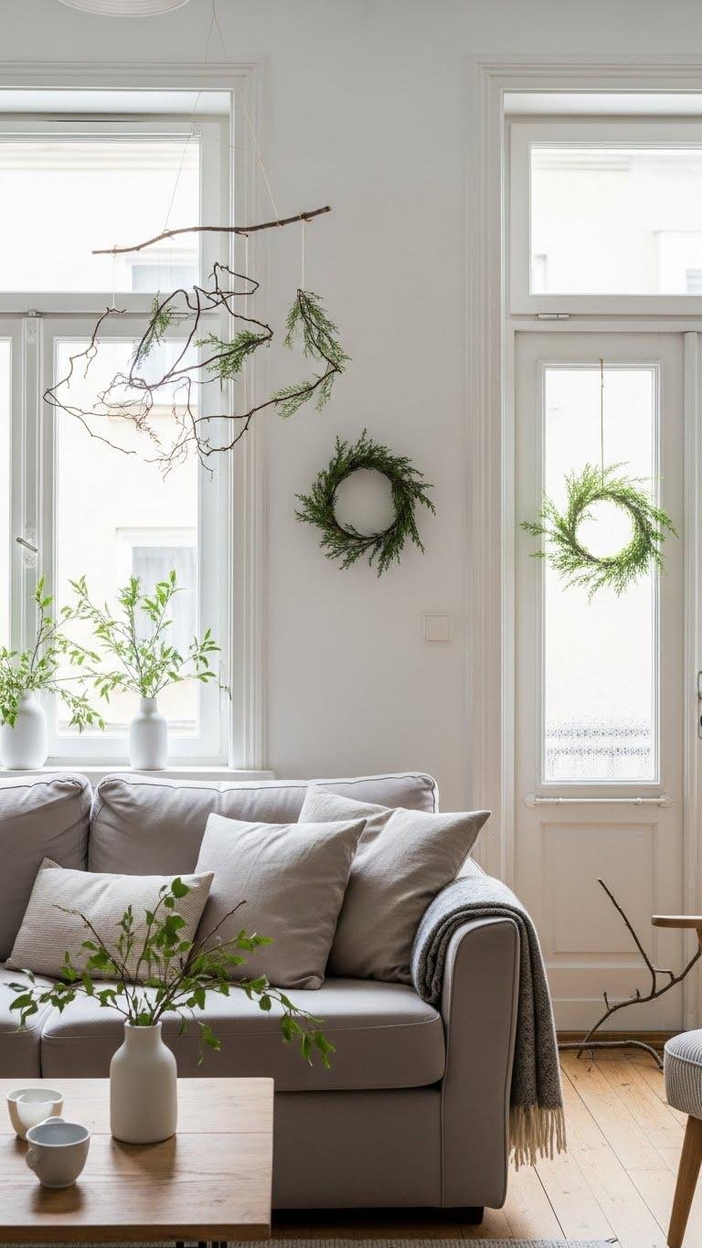 You’ll place sculptural twig mobiles near windows, hang understated winter wreaths on doors, and nest simple sprigs in vases. Choose local clippings, embrace asymmetry, and let natural lines suggest movement while keeping the palette restrained.