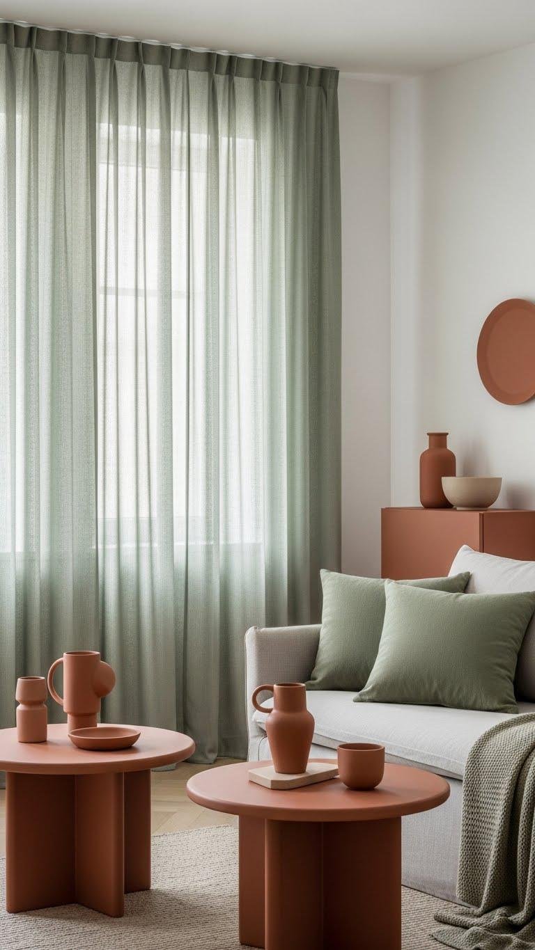 Pair those muted terracotta accents with soft sage-green textiles to introduce a quiet, organic counterpoint that keeps the palette fresh. You’ll lean into freedom-forward minimalism by swapping heavy drapes for lightweight sage curtains, adding texture without weight.