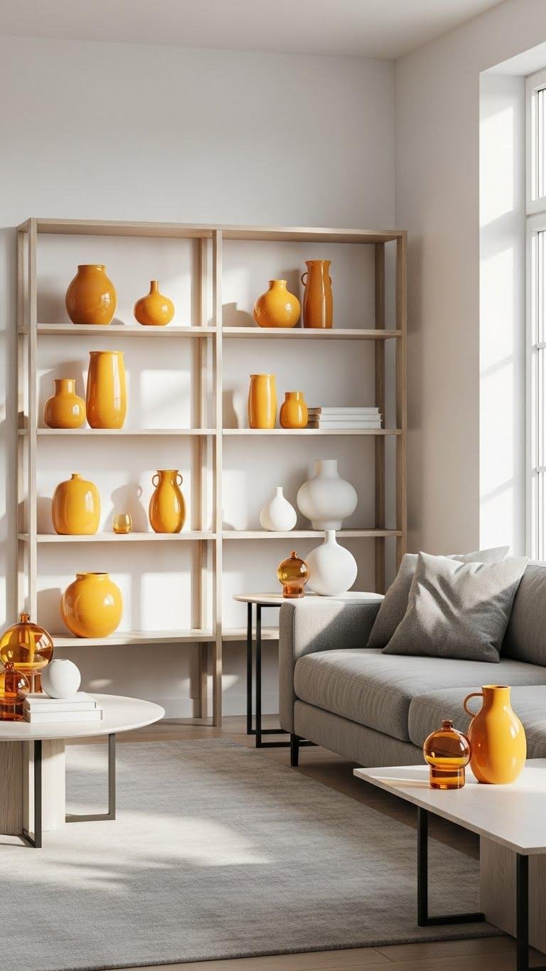 You’ll place honey hued vases on open shelving, pair amber glass baubles with matte ceramics, and let translucent warmth catch natural light.