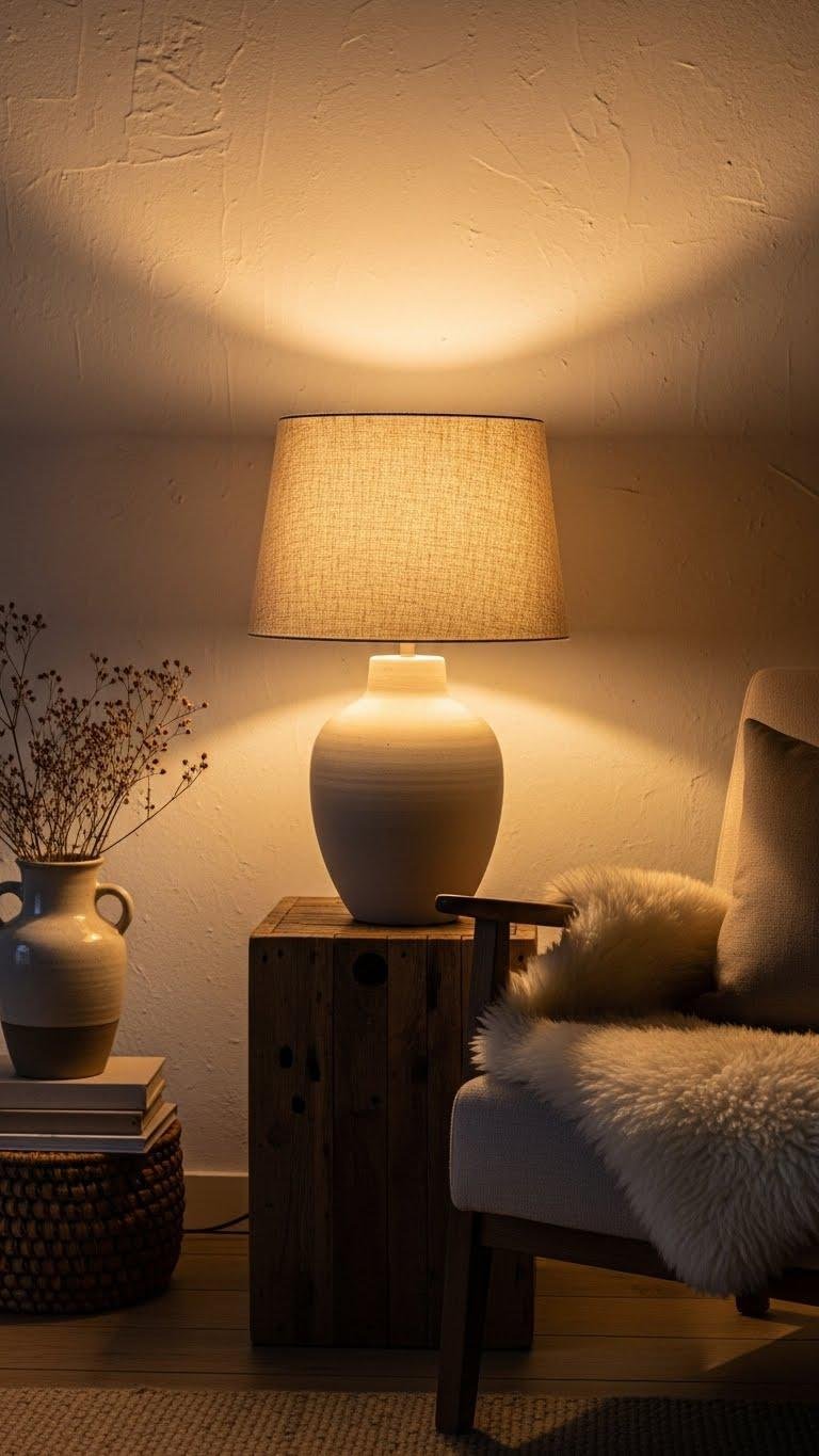Linen shades set the mood, but layering table and floor lamps builds it—use varied heights and bulb temperatures to sculpt warmth and function across a room. You’ll mix accented lampstands and adjustable height lighting to create pockets for reading, relaxing, or entertaining.