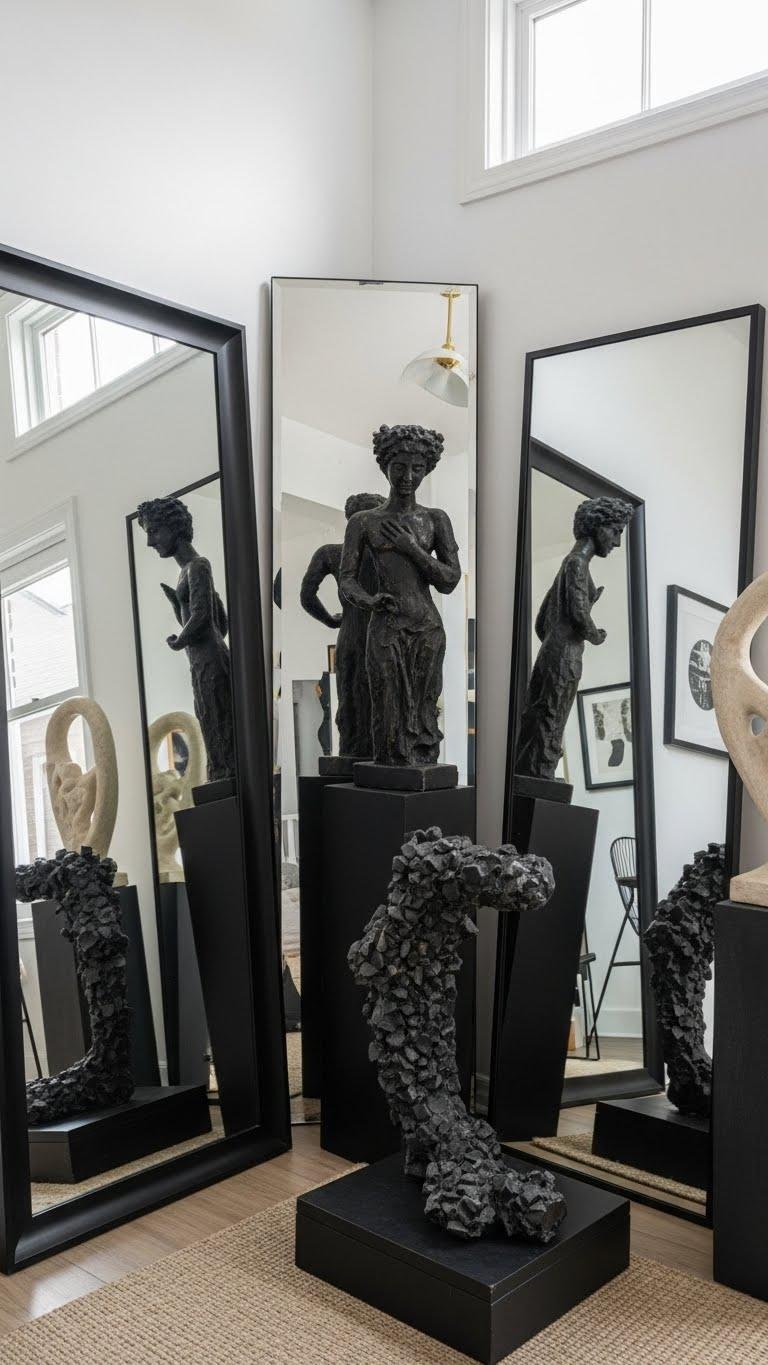 Choose bold frame accents to echo your sculptural choices, keep reflections clean, and let natural light roam so the apartment feels open and liberated.