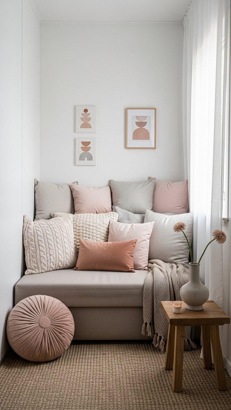 You’ll pick muted pastel pillows to soften lines and invite calm, while miniature abstracts add personality without crowding the eye.