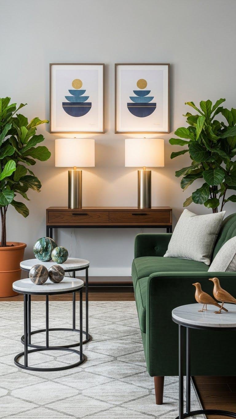 Use mirror symmetry with matching lamps, artwork, or consoles to stretch sightlines and calm the eye.