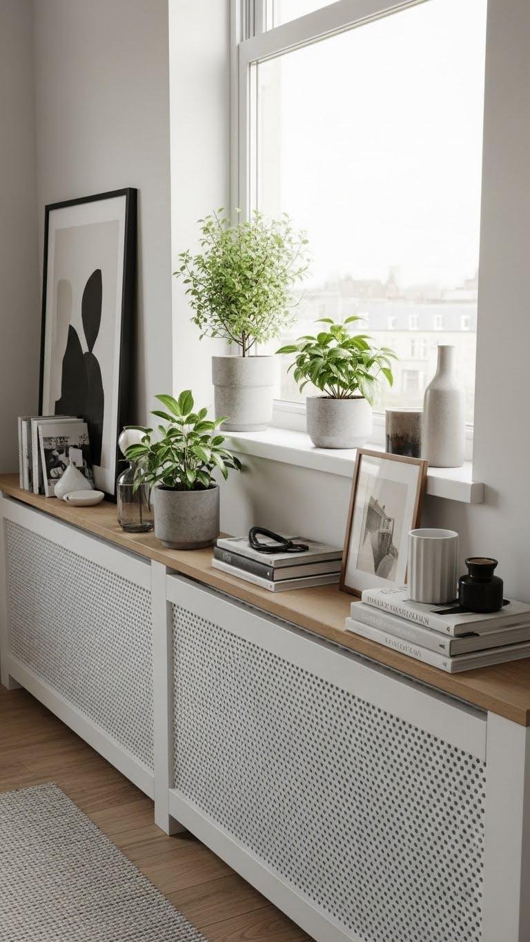 Along a wall or under a window, a slim radiator cover or narrow shelving turns wasted space into a curated stage for plants, books, and art. You’ll craft a narrow shelfscape that reads intentional, not cluttered; choose floating ledges or perforated radiator gallery tops to let heat flow. Keep vignettes minimal, mix textures, and let each object breathe for a liberated, high-end feel.