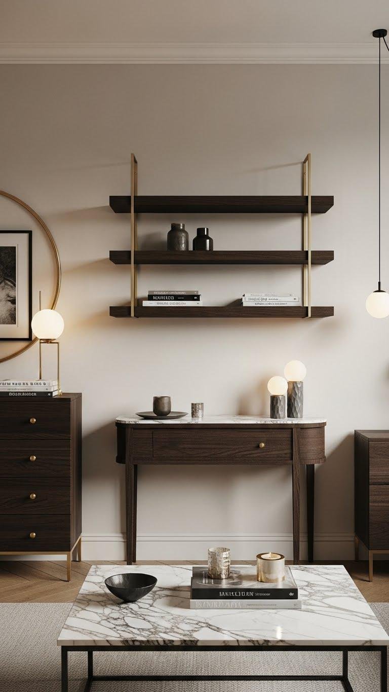 Pair dark wood with marble to create a striking, high-end contrast that reads both warm and sophisticated in a small apartment. You’ll layer dark wood and marble elements—think slim console tops, floating shelves, and a veined contrast tabletop—to anchor brightness without heaviness. Mix matte finishes, brass hardware, and pared-back furnishings so spaces feel open, liberated, and intentionally curated rather than cluttered.
