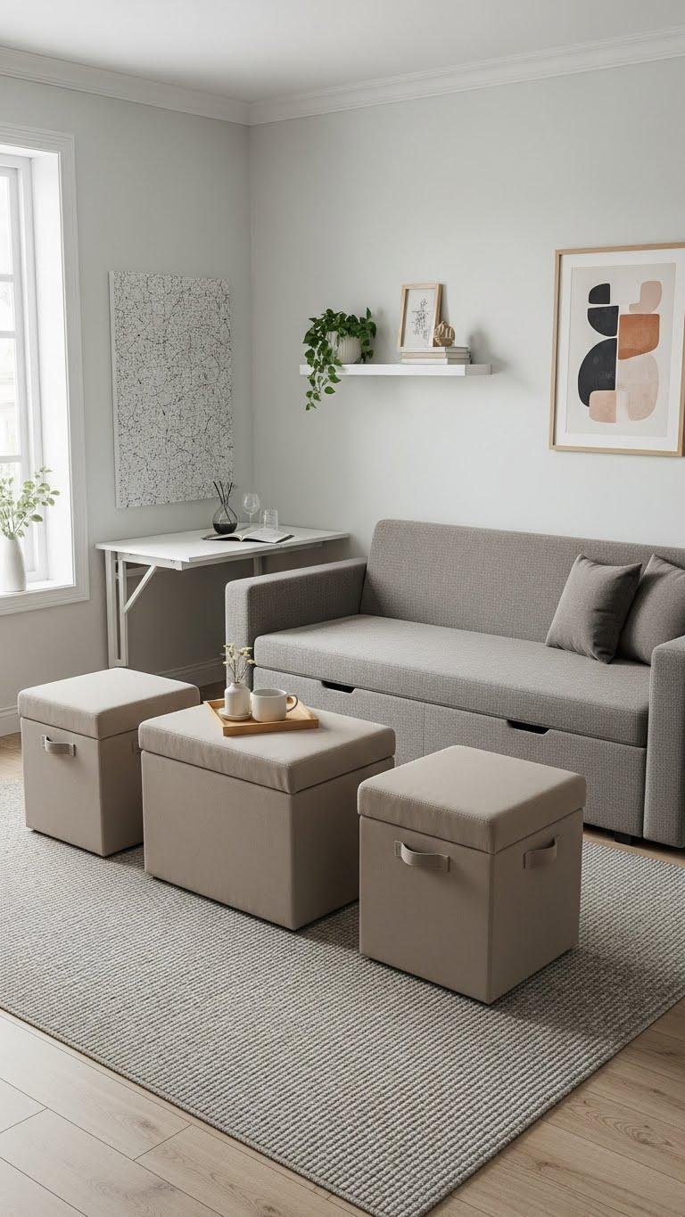 Lean into pieces that do double duty and seem to vanish into the room: choose streamlined sofas with hidden storage, slim-profile dining tables that fold away, and ottomans that convert into extra seating or a coffee table.