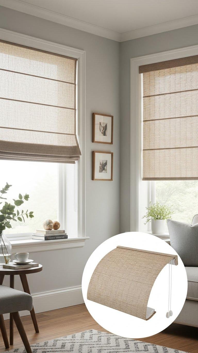 Choose a textured roman for soft folds that diffuse light, or a woven roller for sleek, natural grain.