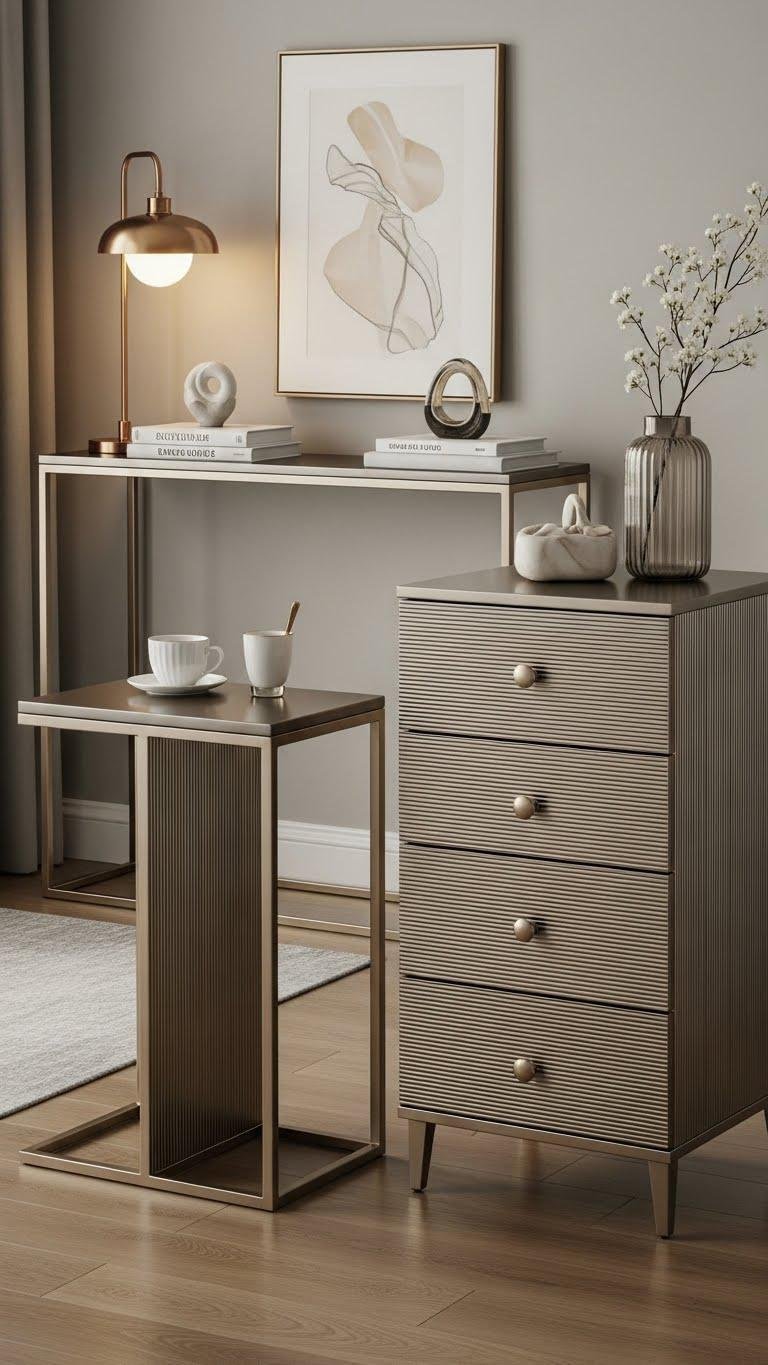 Choose pieces with metallic hardware or subtle ribbed accents—think a slim side table, a compact dresser, or a pared-back console.