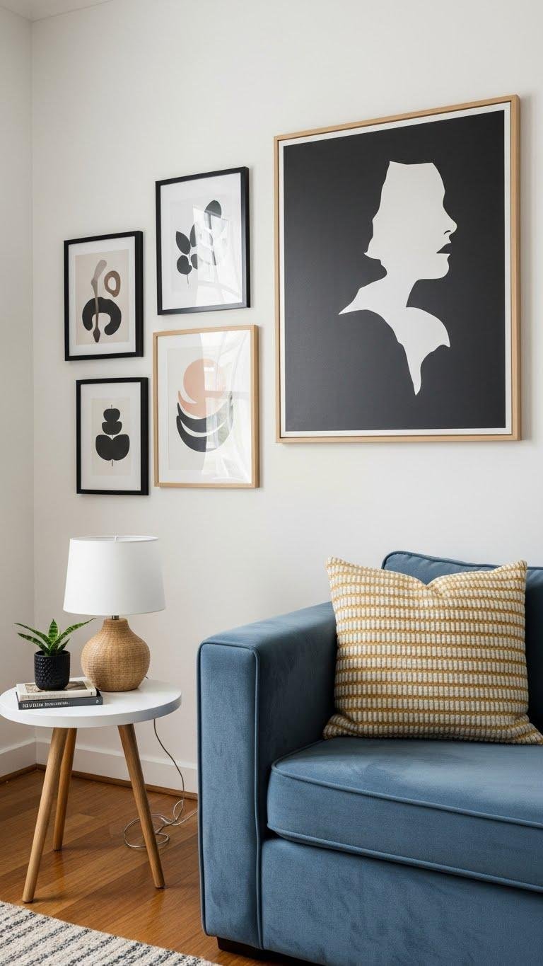 Drawing the eye upward and defining tight wall space, statement frames and art turn compact walls into intentional focal points you won’t regret. You’ll pick bold frames to create structure, pair minimalist prints for airy balance, and stagger heights to suggest movement. Keep a restrained palette, let one large piece breathe, and let curated artwork give your small space a liberated, gallery-like confidence.