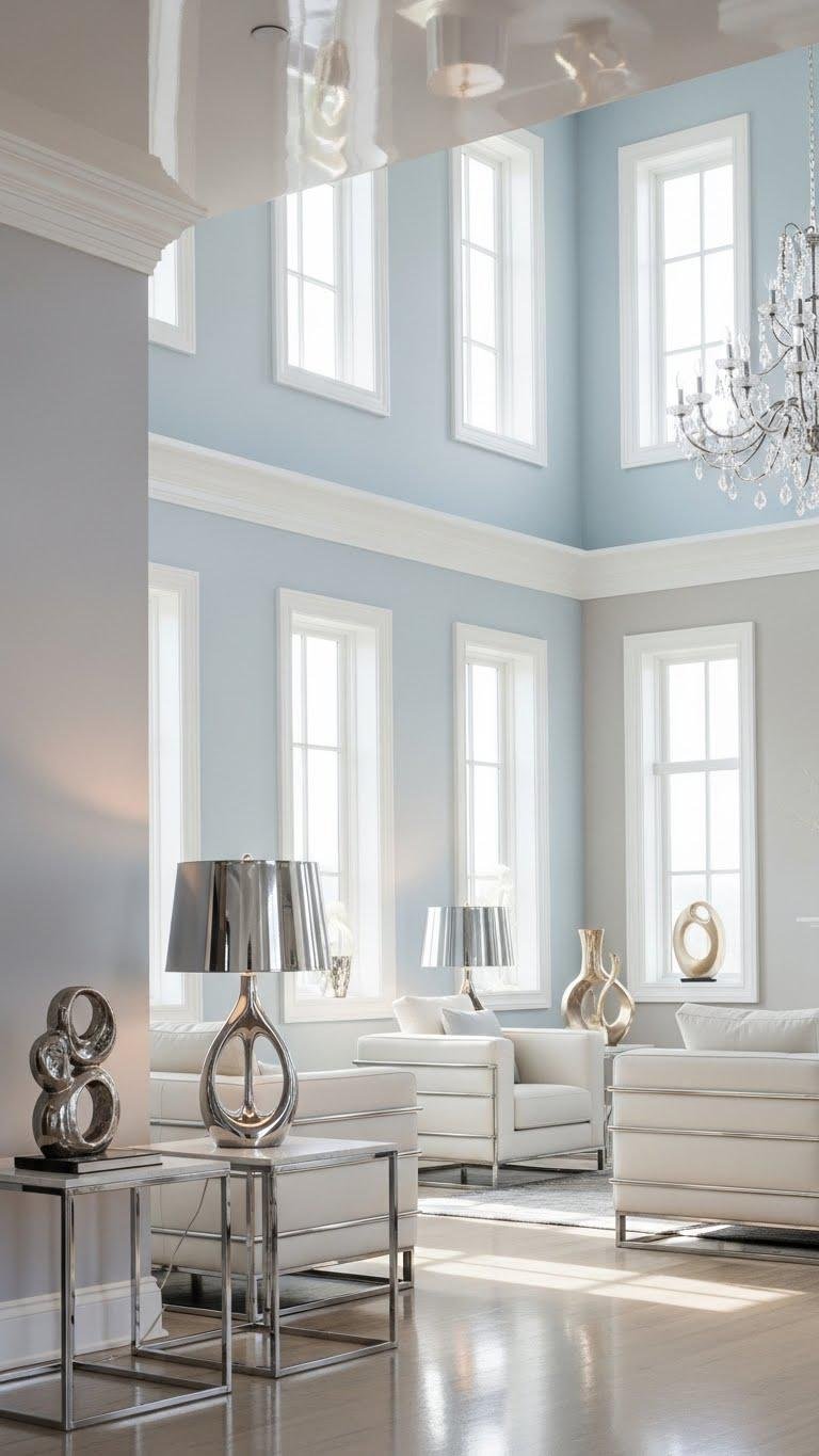 Pairing metallic accents with bright ceilings and trim will amplify that open, airy vibe—light bounces farther when the overhead plane and moldings stay luminous. You’ll keep sightlines effortless by choosing crisp bright ceilings and glossy painted trim to frame walls without heavy contrast. The result feels modern, unrestricted, and higher-end—minimal effort, maximum visual lift that frees your small space.