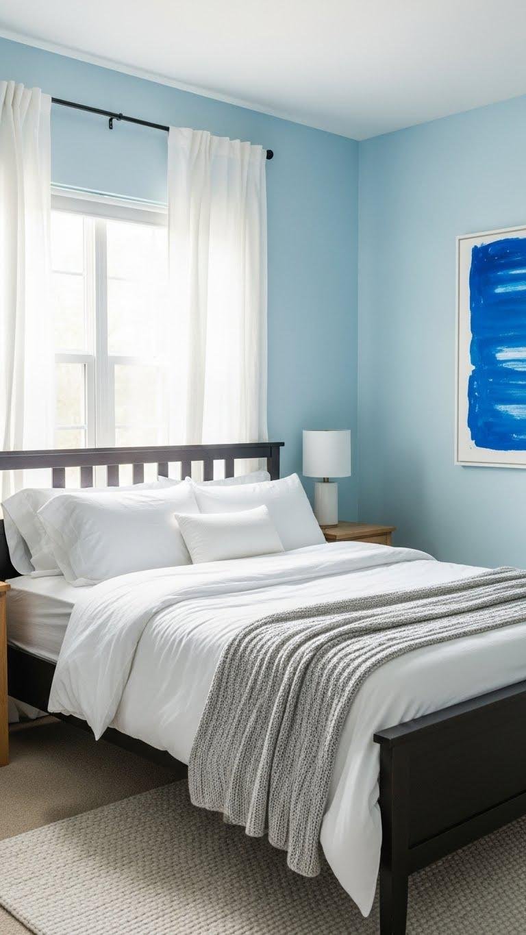 When you paint the walls a soft sky blue, the room instantly feels calmer and more spacious; pair it with warm wood tones and crisp white linens to keep the vibe modern and cozy.