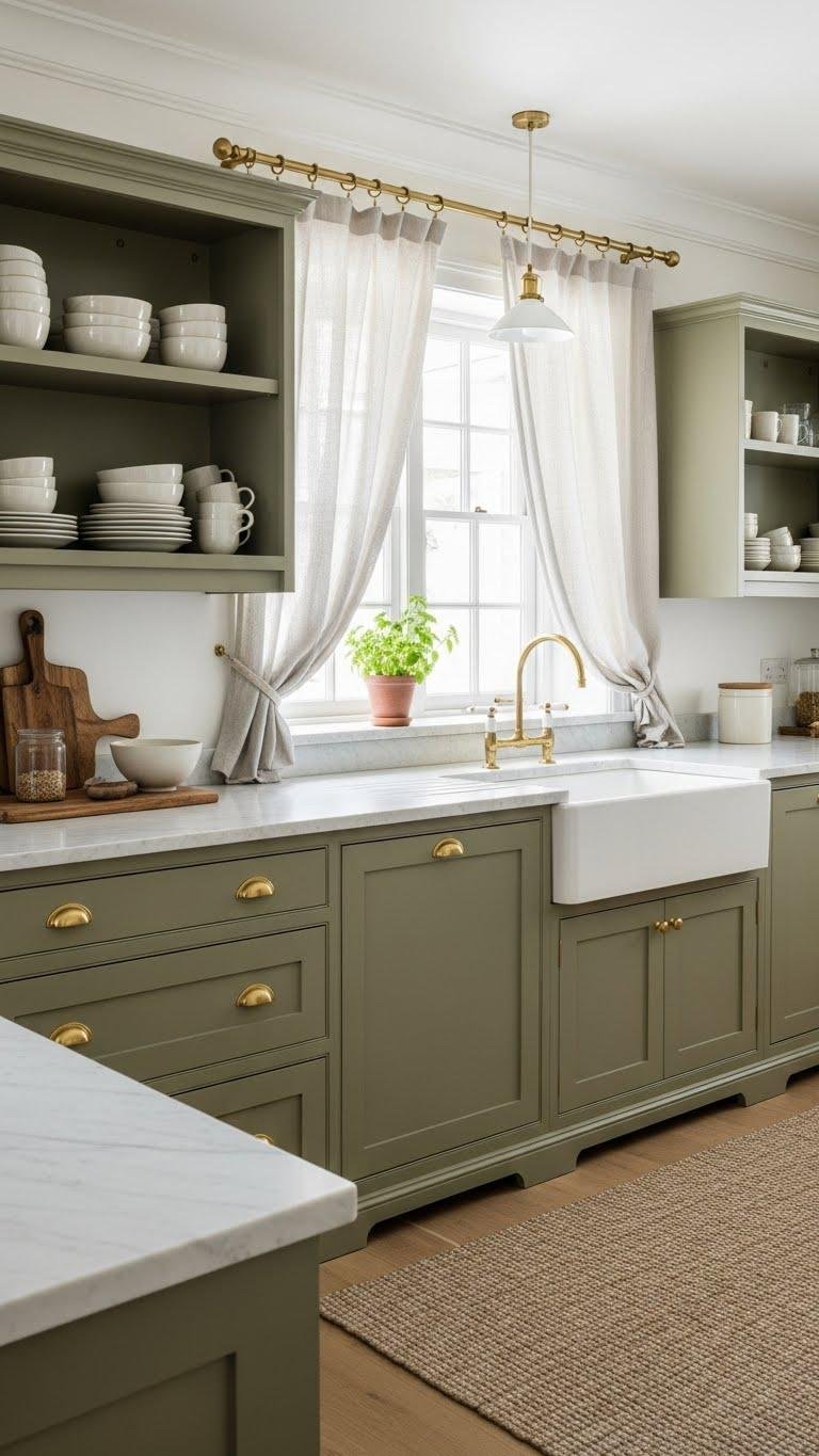 After enjoying the soft serenity of blush and creamy ivory, bring a grounded freshness into the kitchen with pale olive accents. You’ll pair matte olive cabinets or open shelving with marble countertops for contrast, add warm brass hardware for a modern vintage touch, and hang airy linen curtains to soften light.