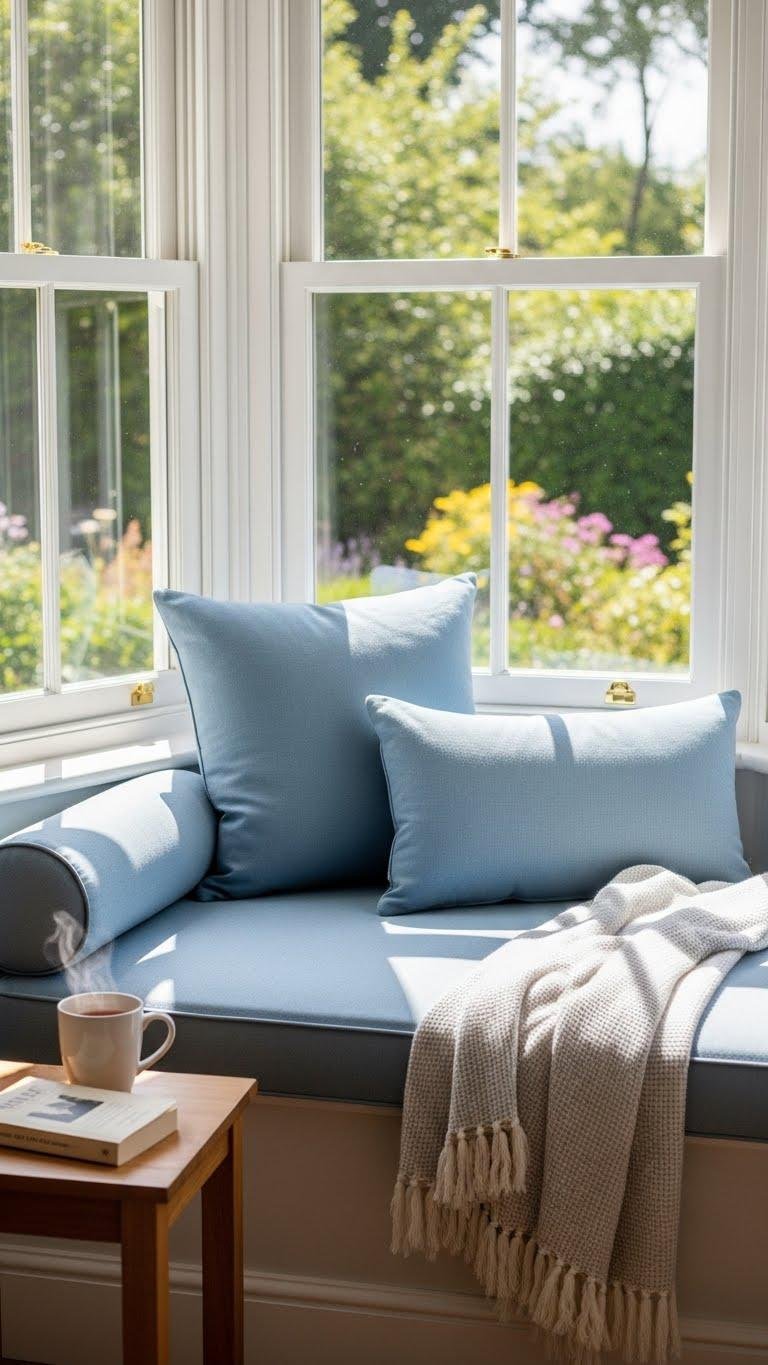 Tuck a powdered blue window seat into a sunny bay and you’ll instantly give the room a soft, uplifting anchor. You’ll choose linen upholstery for tactile calm, layer light throws and streamlined cushions, and keep decor minimal to let fresh air and light roam.