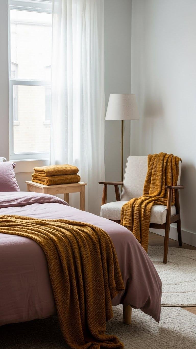 To give your mauve bedding a little warmth, introduce subdued mustard throws as a restrained accent that lifts the palette without overpowering it. You’ll pair vintage ochre knit throws with clean lines, embracing marigold minimalism to add confident color without clutter. Drape one at bed’s end or over a chair to invite comfort, movement, and a liberated, modern calm.