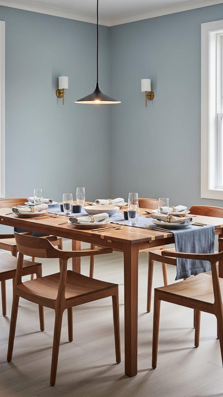 If you want a dining space that feels both soothing and stylish, layer soft blue-greys with warm woods and subtle brass accents to create a restrained yet inviting atmosphere.