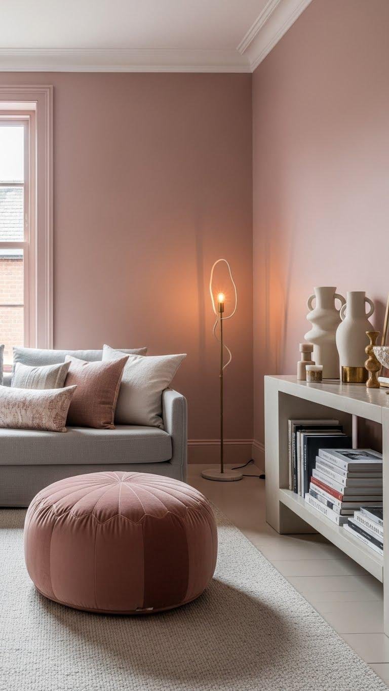Often you’ll find dusty pink brings a soft, modern warmth that anchors a living room without overwhelming it. You’ll mix airy walls with a velvet pouf for tactile contrast and a streamlined ceramic sideboard to keep surfaces calm.