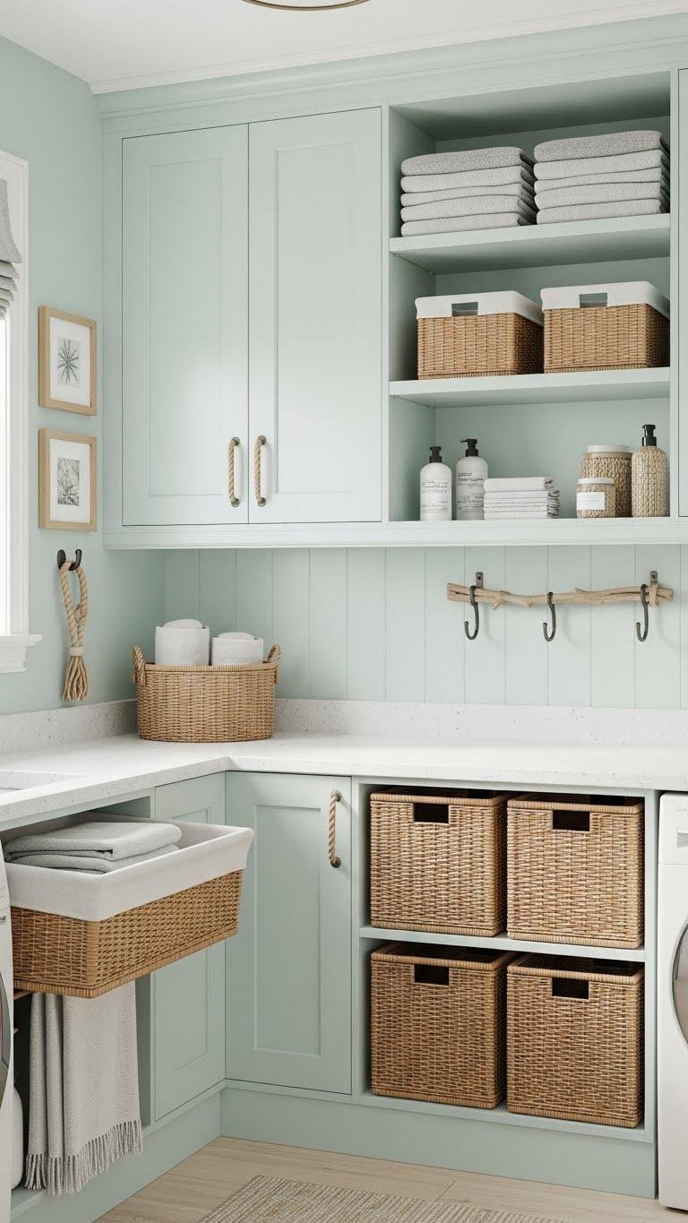 Refresh your laundry routine with a pale seafoam palette that makes even the smallest utility room feel airy and intentional. You’ll pair linen hues with crisp white shelving, open baskets, and simple hardware to keep chores light. Add subtle coastal accents—rope handles, driftwood hooks—to evoke calm. You’ll streamline storage, choose matte finishes, and create a liberating, serene space that encourages efficiency and ease.