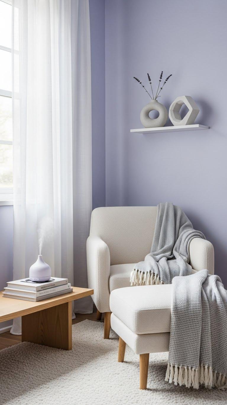 Carry the soft warmth of dusty rose into a serene nook by introducing pale lavender as your main hue; it cools the palette while keeping the room feeling cozy and modern. You’ll place minimalist seating, soft throws, and a low table for books. Add a diffuser with lavender aroma, gauzy curtains, and sculptural accents so you can relax, breathe, and reclaim calm.
