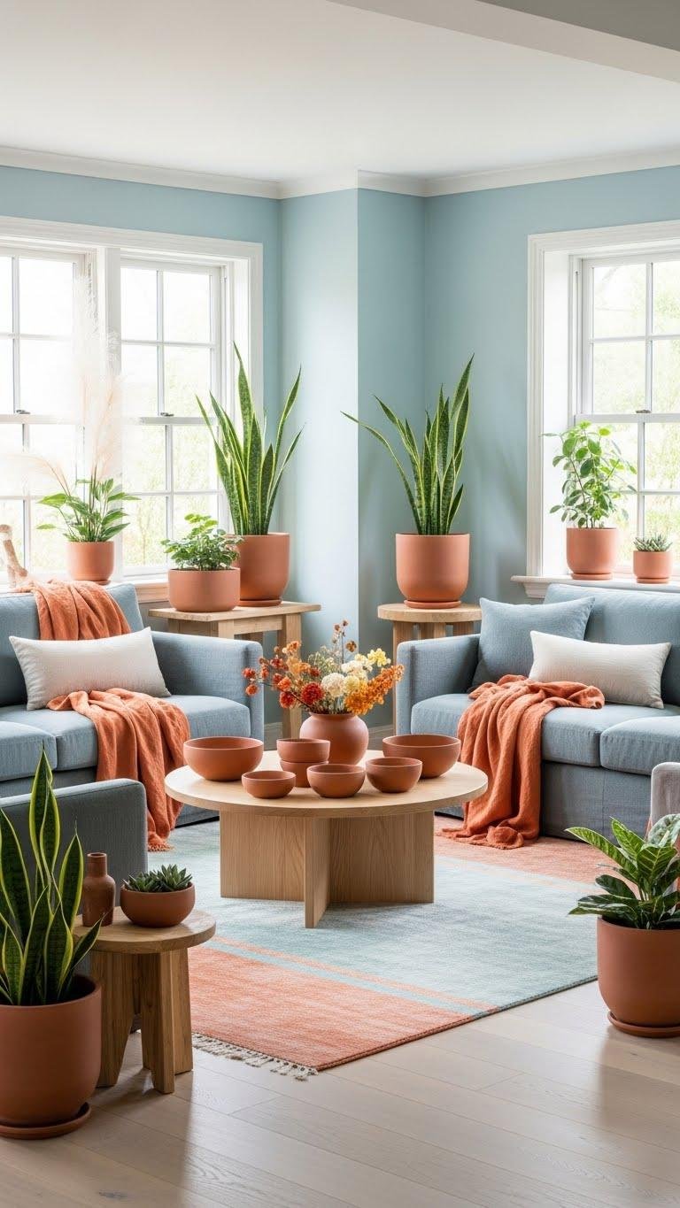 After the airy aqua palette calms the senses, bring grounded warmth with muted terracotta touches that feel both modern and lived-in. You’ll layer handcrafted terracotta planters, matte terracotta bowls, and soft linens in sunbaked hues.