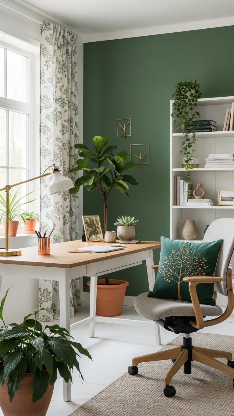 Choose forest inspired textiles for curtains and chair cushions to add depth and tactile calm. Keep accessories minimal, add warm metallics for contrast, and arrange plants to maintain an open, liberating workspace.