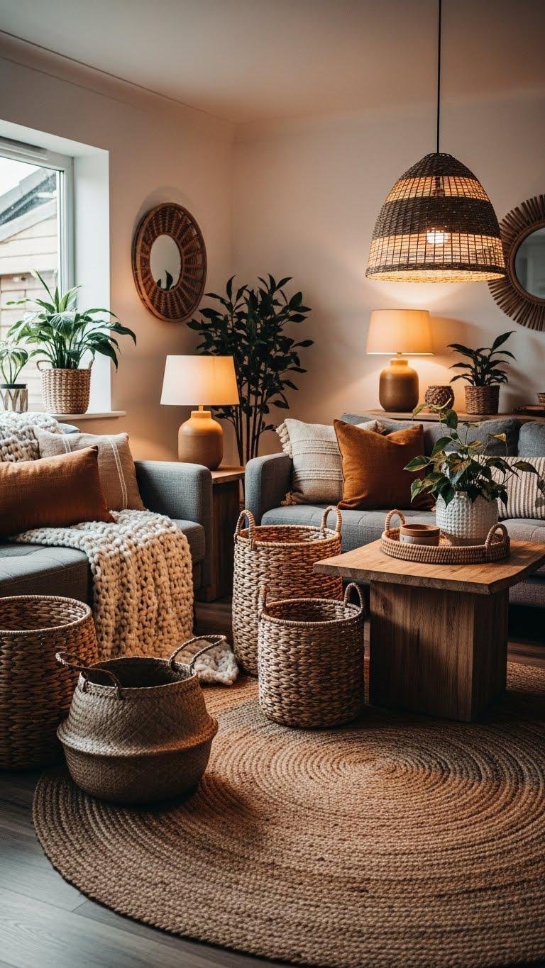 Natural fibers and woven baskets set the stage, but lighting truly seals the room’s mood—soft, warm ambient light makes those textures feel inviting instead of flat.