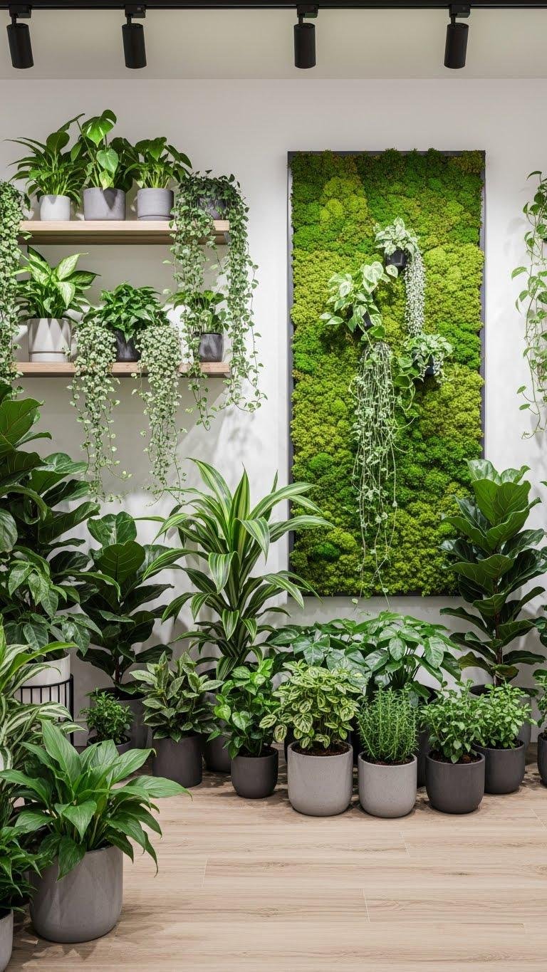 Bring plants in to soften straight lines and add life—select a mix of sculptural floor plants, trailing varieties for shelves, and a few small potted herbs to keep things practical. You’ll choose air purifying plants for cleaner indoor air, cluster pots for visual rhythm, and consider a vertical mosswall as a bold, low-maintenance focal. Rotate and water mindfully to keep freedom and calm.