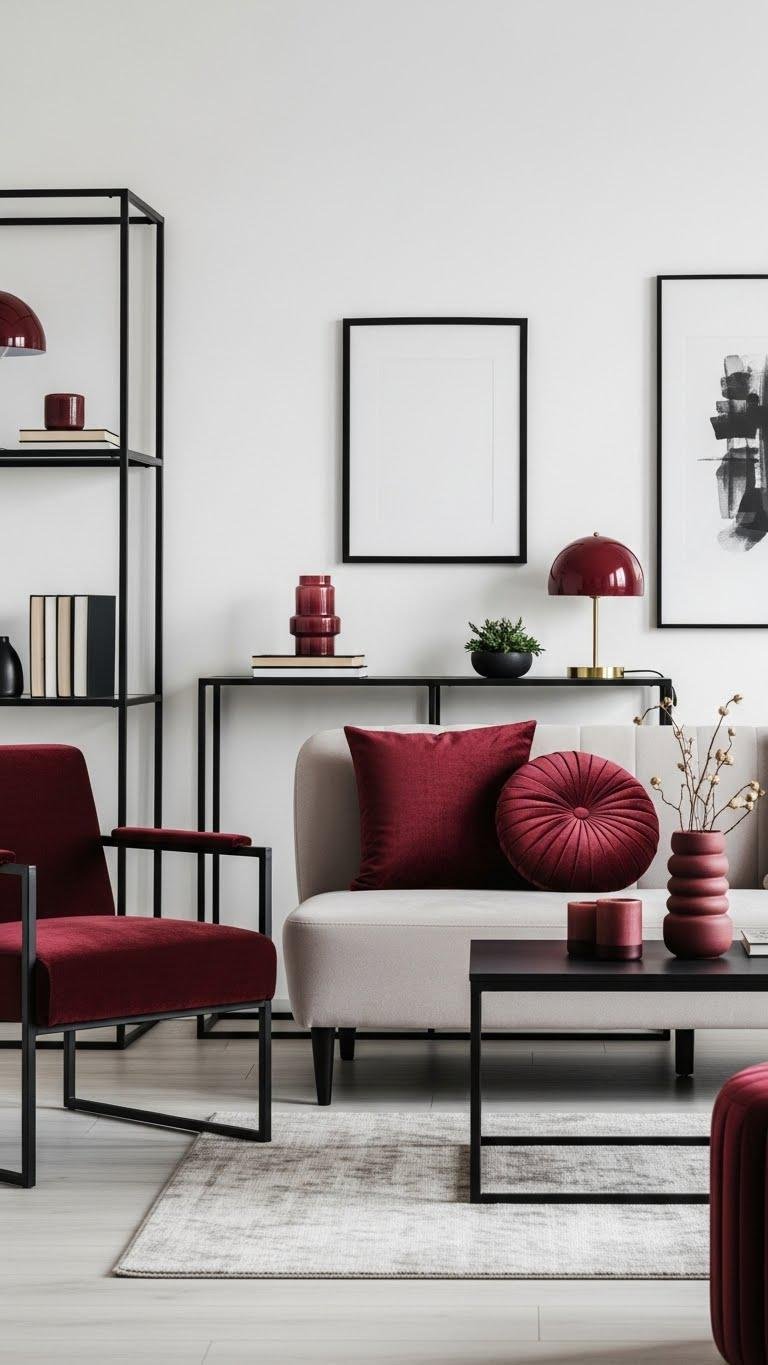 Slide in soft black or deep garnet accents to ground a light, airy scheme without making the room feel heavy; these hues read rich and modern when used sparingly—think matte-black metal frames, a velvet garnet cushion, or a low-sheen area rug—to add depth and warmth.