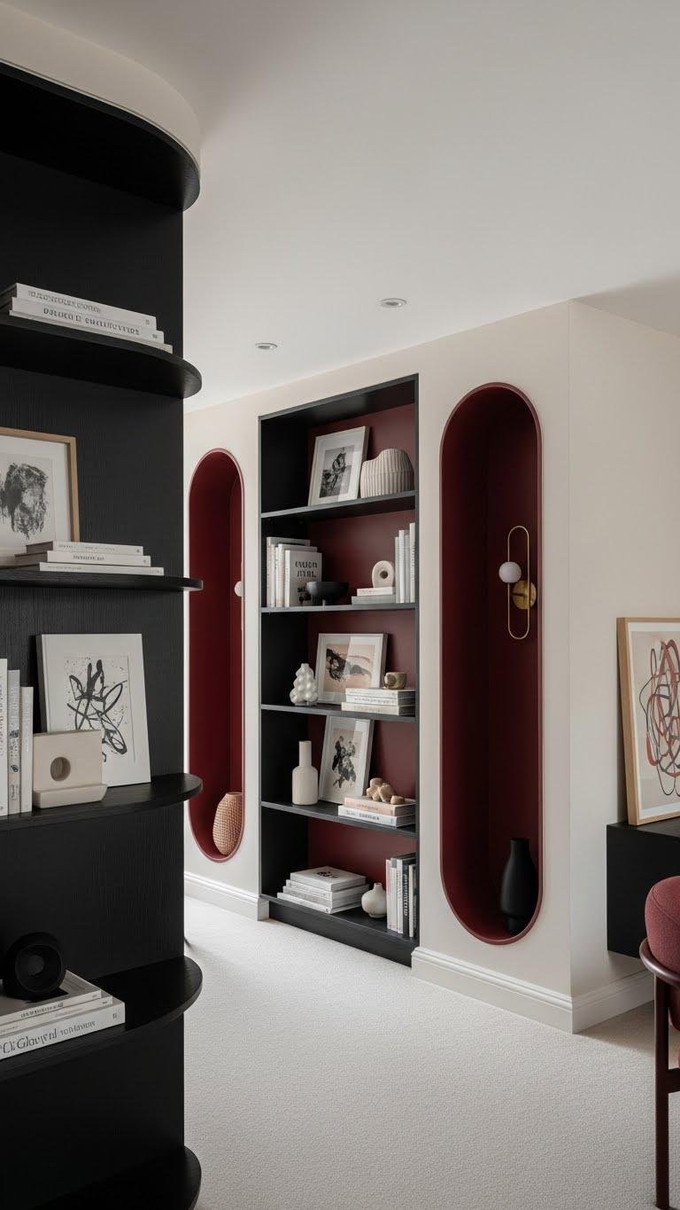 After anchoring the room with soft black or deep garnet accents, introduce curved shelving or bookcases to soften the geometry and guide the eye through the space.