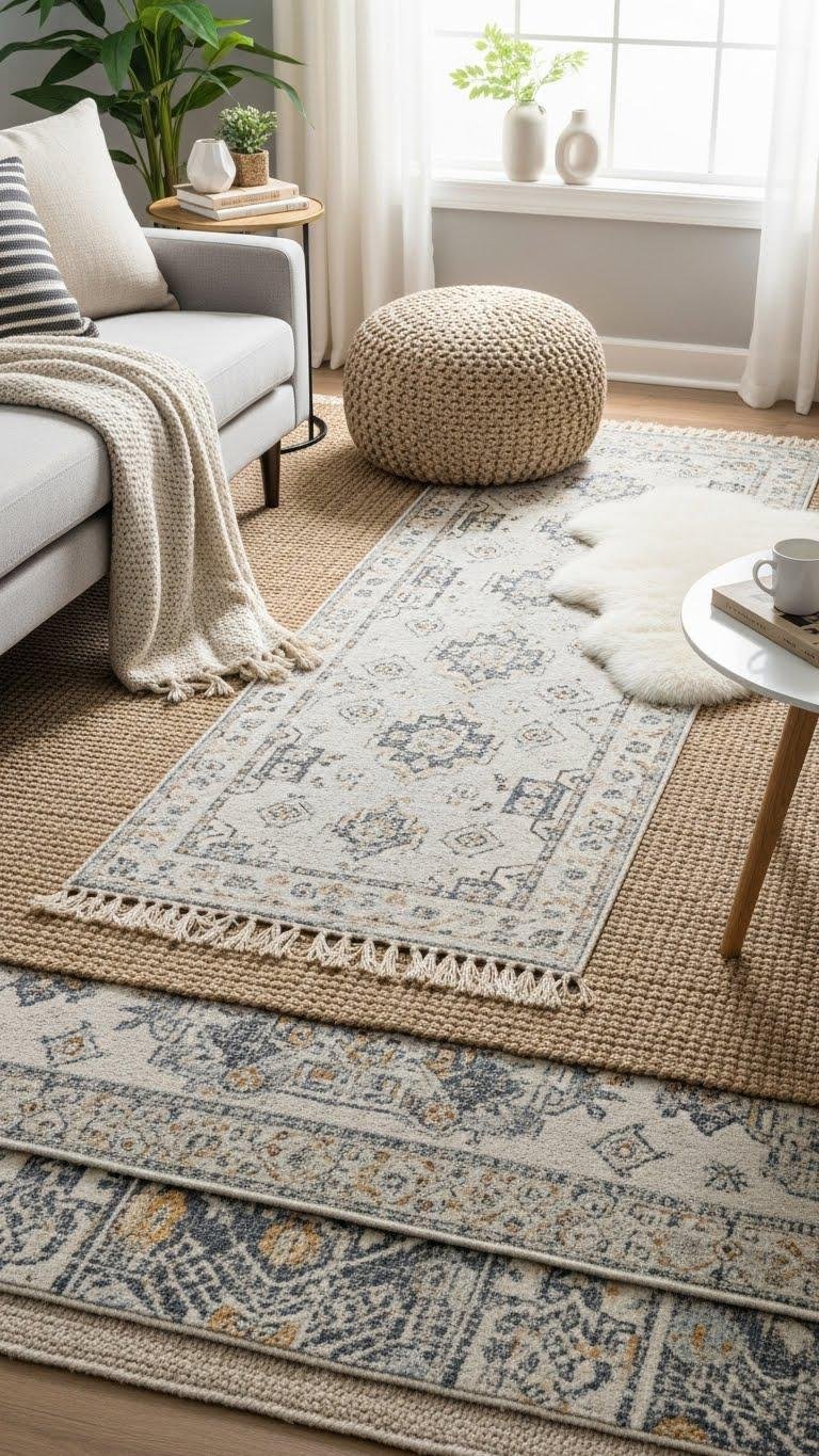You’ll anchor furniture with a layered jute base, then add a patterned runner or plush accent rug to delineate zones and introduce subtle contrast.