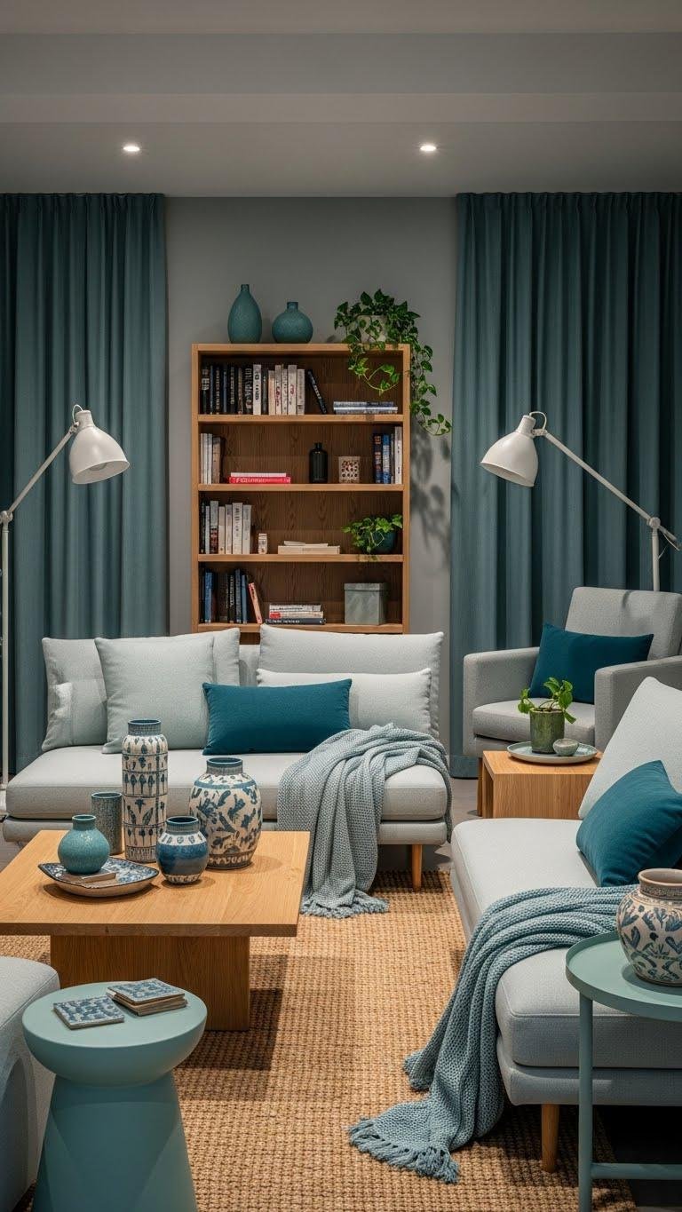 After you’ve crafted a serene reading nook with warm, adjustable light, extend that same calm by layering subtle blues and muted greens throughout the room.