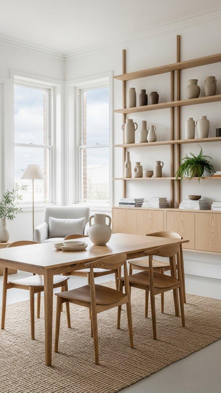 A pale oak table or ash shelving can instantly brighten a room and keep the focus on textures and form rather than heavy color.