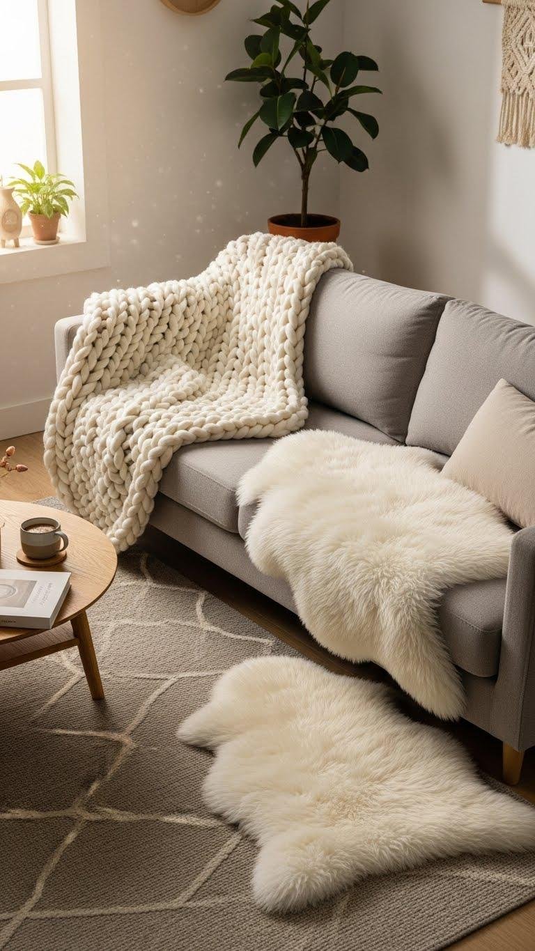 Combining throws and rugs adds immediate tactile interest and helps define zones without changing your color palette. You’ll layer tactile contrasts—cozy knit throws over sleek linen sofas, low-pile rugs beside fluffy sheepskins—to create freedom in how you live.