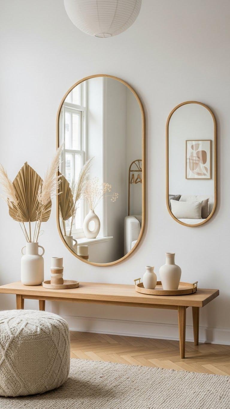Place mirrors opposite windows to amplify daylight, and mix rounded trays, vases, and wall mirrors to create flow. The result feels airy, intentional, and effortlessly free.