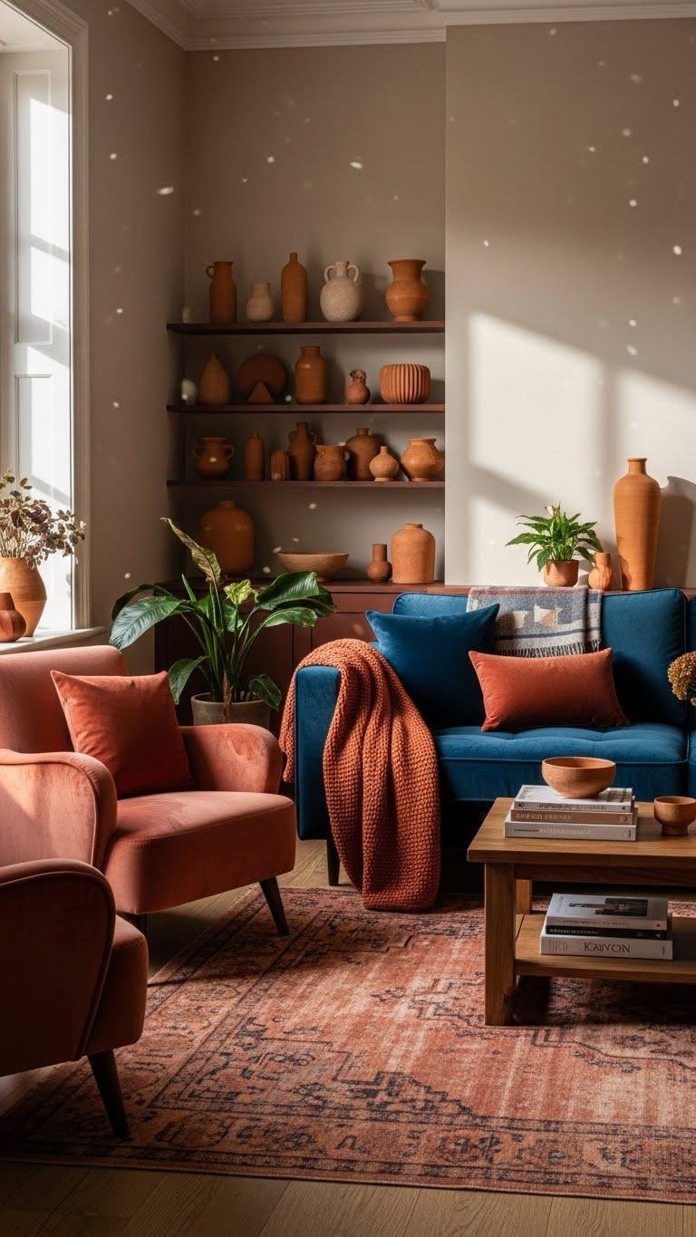 Velvet’s deep jewel tones pair beautifully with the earthy warmth of terracotta and ochre, which you can use to balance richness with grounded color. Embrace terracotta textiles for cushions, throws and rugs to add tactile warmth, then punctuate shelves and tables with ochre ceramics for sculptural, sunlit accents. You’ll create a liberated, calm palette that feels modern, tactile and inviting.