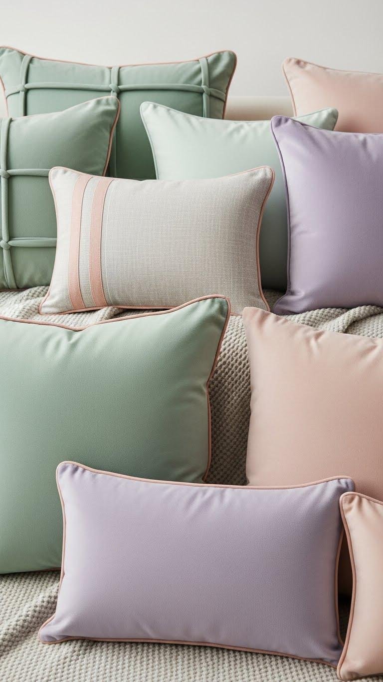 Pile on pastel pillows in sage, blush, and lavender to give your sofa an instant soft-focus makeover. Mix sage tufting with linen textures and add blush piping for contrast; toss in a lavender velvet for mood.