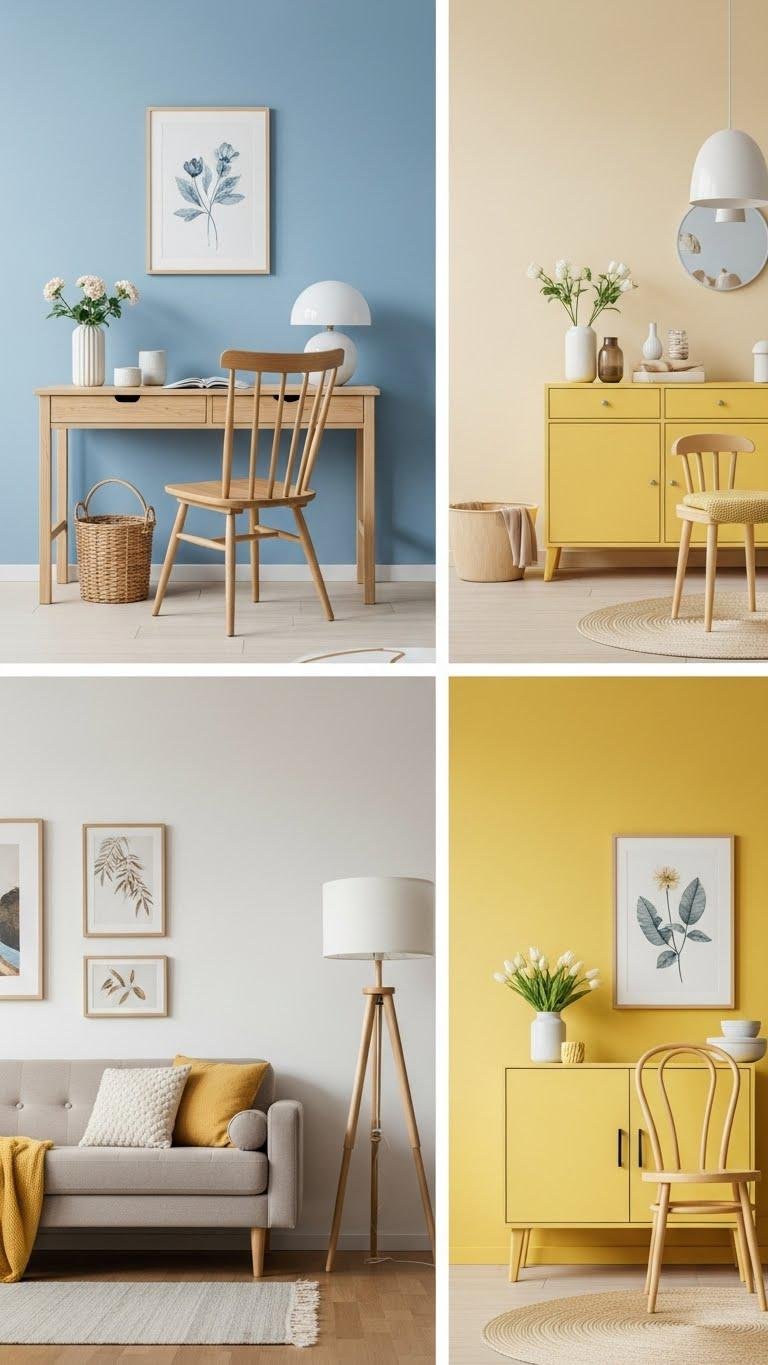 A pop of powder blue or butter yellow can instantly lift a room, so pick the hue that speaks to your mood—serene and sky-like or sunny and cozy—and paint a single wall to anchor the space. Go bold but chill: pair powder blue trim with warm neutrals, or echo butter yellow cabinetry for cheerful cohesion. You’ll feel playful, free, and on-trend.
